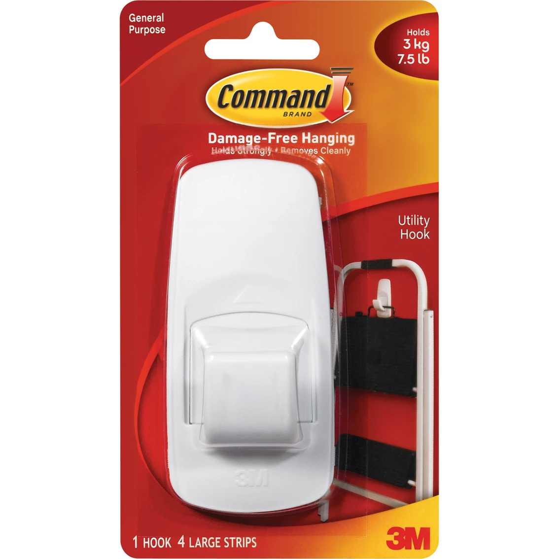 Life is easier when everything has its place. Organize your home damage-free with Command Utility Hooks. Command Hooks let you hang what you want, where you want, without the hassle of tools and nails. Command Strips hold strongly on a variety of smooth, finished surfaces, and these adhesive hooks remove cleanly with no sticky residue or damage left behind. Now you can organize your home or office just the way you want with Command Utility Hooks. INCLUDES – 1 Jumbo, white Command Utility Hook and 2 Jumbo Command Strips; 1 hook holds up to 7.5 lbs.DAMAGE-FREE ORGANIZATION- Say goodbye to holes, marks, or sticky residue on your walls, doors, cabinets, or closets; Command Hooks by 3M are easy to use and help keep your walls looking beautiful. NO TOOLS REQUIRED- Hang clipboards, brushes, dog leashes, kitchen utensils, and accessories where you want without nails or a hammer. STRONG AND VERSATILE- Command Utility Hooks hold strongly on a variety of indoor surfaces including painted walls, finished wood, glass, tile, metal, and other smooth surfaces. REMOVES CLEANLY- Reorganize when inspiration strikes; These wall hooks leave no sticky adhesive behind; Perfect to use inside cabinets and closets, in your college dorm, apartment, home, and office