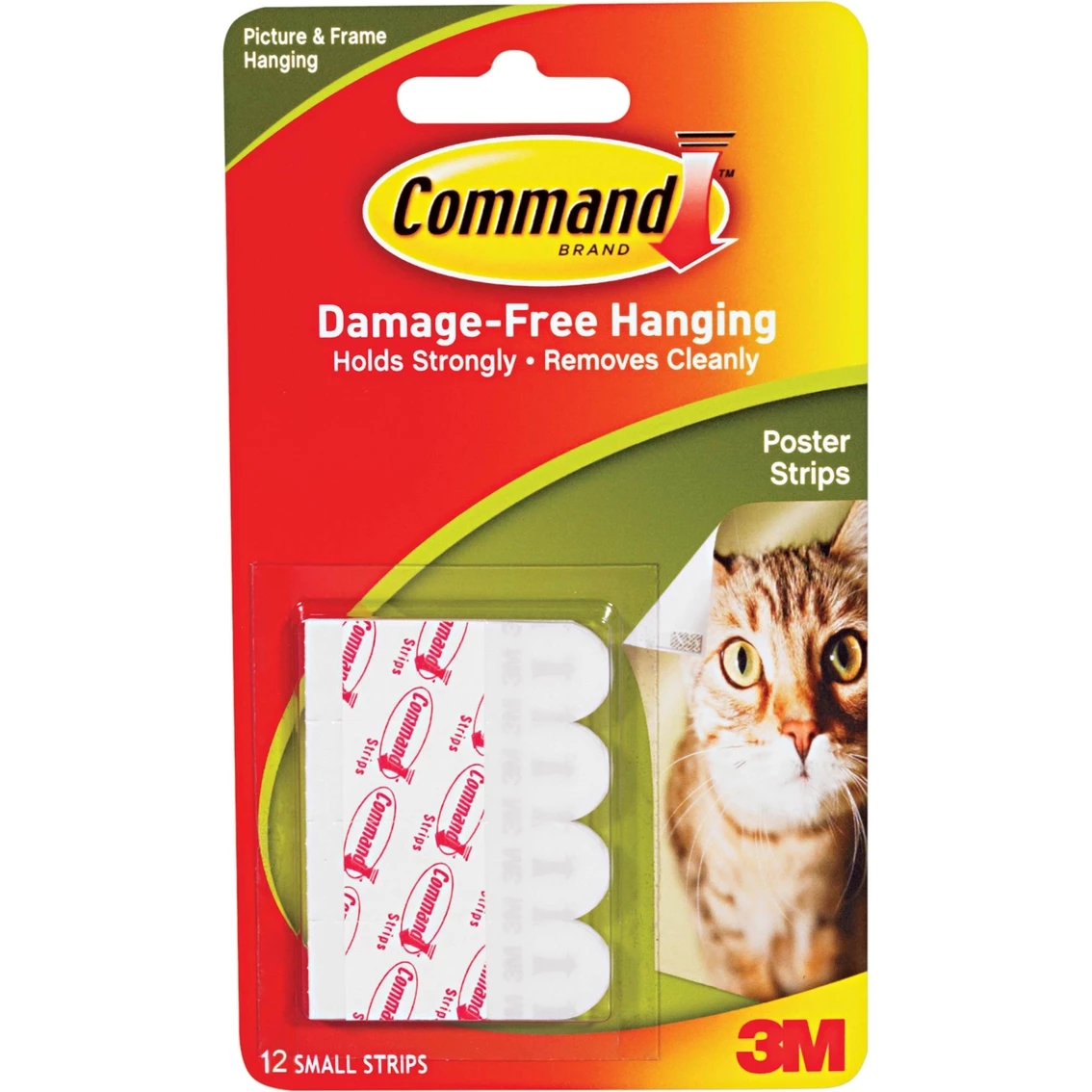 Decorate your world without damaging your walls with 3M Command Poster Strips. Command Poster Strips let you hang posters, kidโs artwork, banners and signs without the hassle of tools and nails. Command Strips hold strongly on a variety of smooth, finished surfaces, and these adhesive strips remove cleanly with no sticky residue or damage left behind. Now you can decorate your home, office, or dorm room just the way you want with Command Poster Strips. Hangs up to 6 posters or signs.