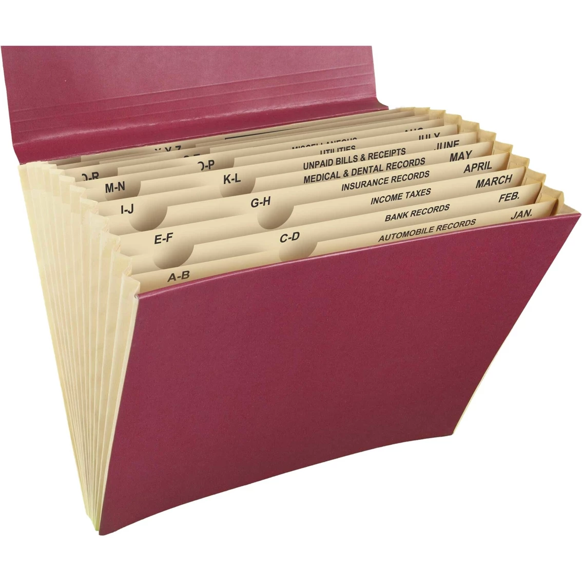 Keep your most important documents organized throughout year with the Mead All Purpose 12 Pocket Letter File. Expanding 12 pockets provides plenty of storage space. Preprinted tabs let you file by month, alphabetically or by household necessities. 10 1/8 in. x 12 in. overall size is perfect for letter size papers A top flap and bungee closure keep pages securely in place. Crafted of Cheshire linen material. Available in assorted colors, including navy, burgundy, green and black.