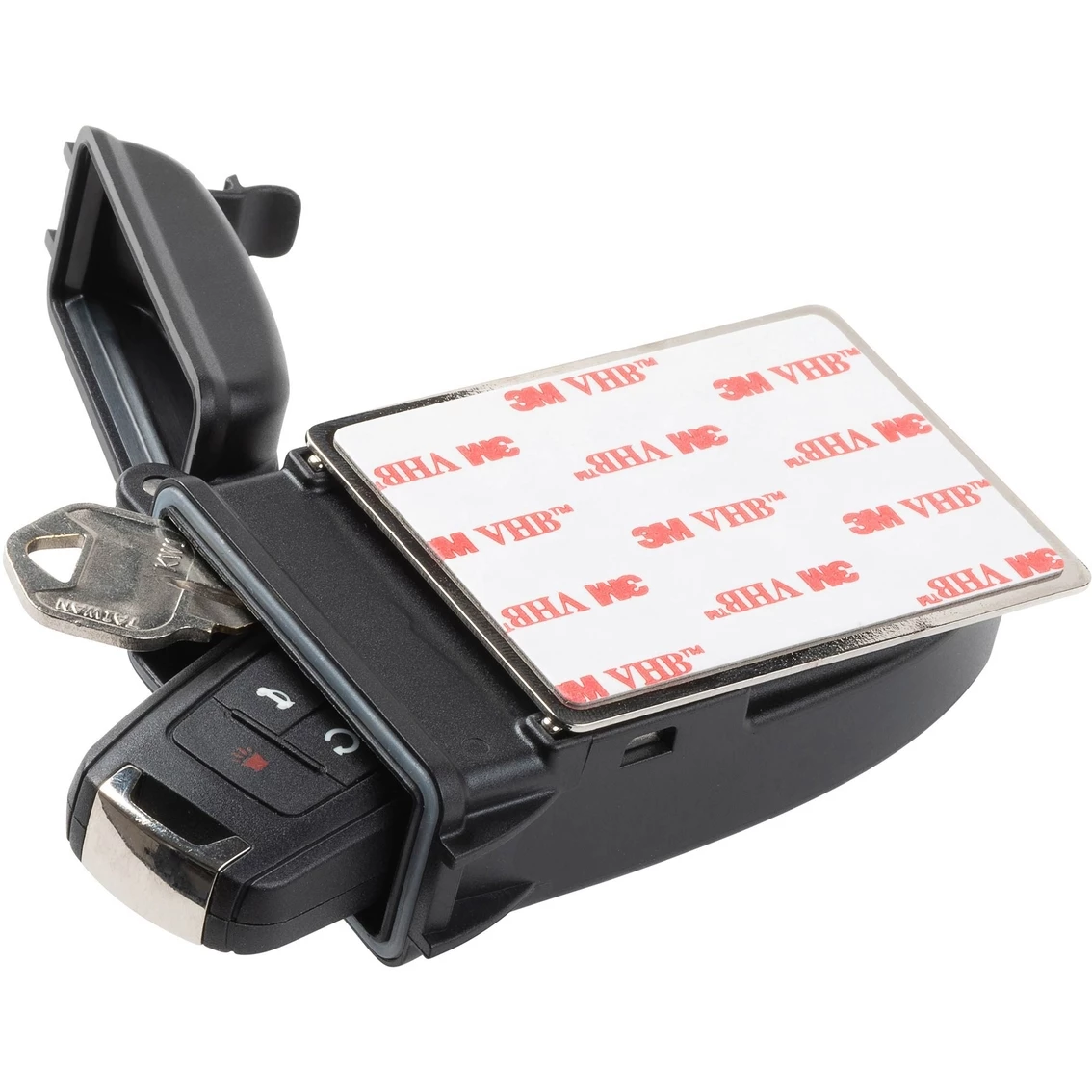 Store your modern key fobs, spare house keys and other critical keys practically anywhere with room to spare with this magnetic key box from Nite Ize. Holding a key fob and multiple keys at a time, the Hide Out XL key box secures under your car and other metal surfaces using not two, but three powerful neodymium magnets. Through every twist and turn, Hide Out XL will keep your keys safe and secure, providing peace-of-mind and assurance that car or home lockouts are a problem of the past. On top of staying in place, your keys will stay dry through snowy days and rainy nights, preventing rust or water damage to your fob with an IPX7 waterproof seal. If you prefer to hide your keys under the house or deck, HideOut has you covered with an included metal plate and 3M VHB adhesive for securing to wood, plastic and other nonmetal surfaces. Model: KBXL-01-R7.