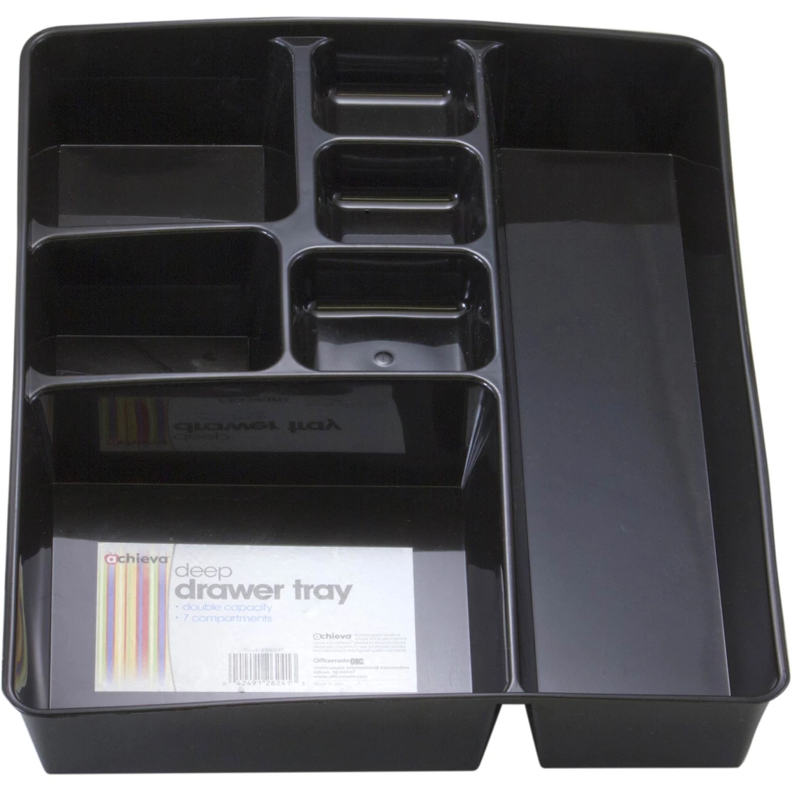 The Officemate Drawer Tray Deep Dish comes in stylish and innovative designs. Clean lines and a compact footprint makes this an efficient means to organize your workspace. 7 compartments to separate your items. Longer compartment for big items and an extra wide compartment for bulkier items. Tray is extra deep to hold more items in each compartment. Made from 30% post consumer recycled plastic.