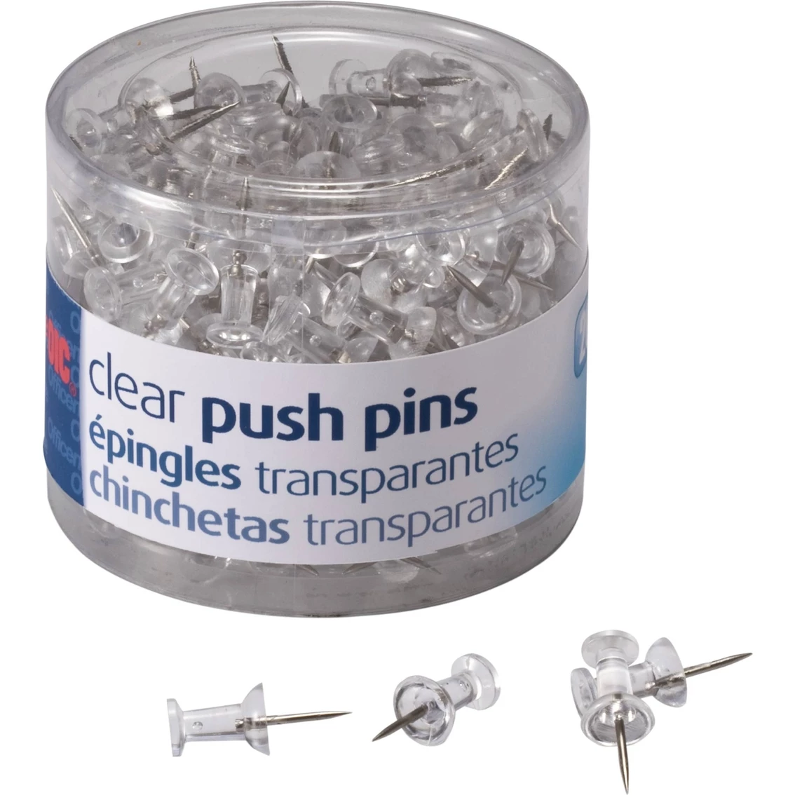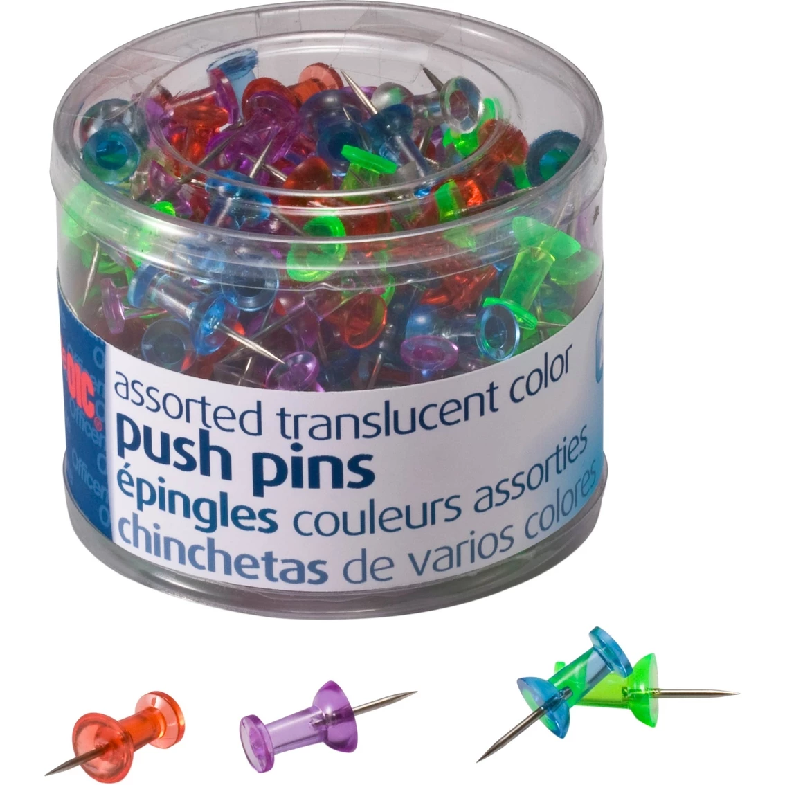Vibrant colors brighten bulletin boards and attract attention. Officemate plastic head clips and fasteners/push pins are precision crafted with 3/8 in. hardened steel points for lasting strength. Perfect for tacking up pictures, artwork, memos and more. As easy to pull out as they are to push in. Excellent choice for use on bulletin or cork boards. Packed in reusable storage tub. Heads are 1/4 in. in diameter and 1/2 in. in length. Model: 35710.