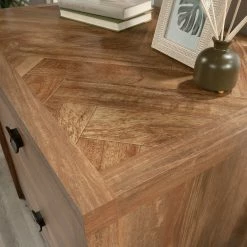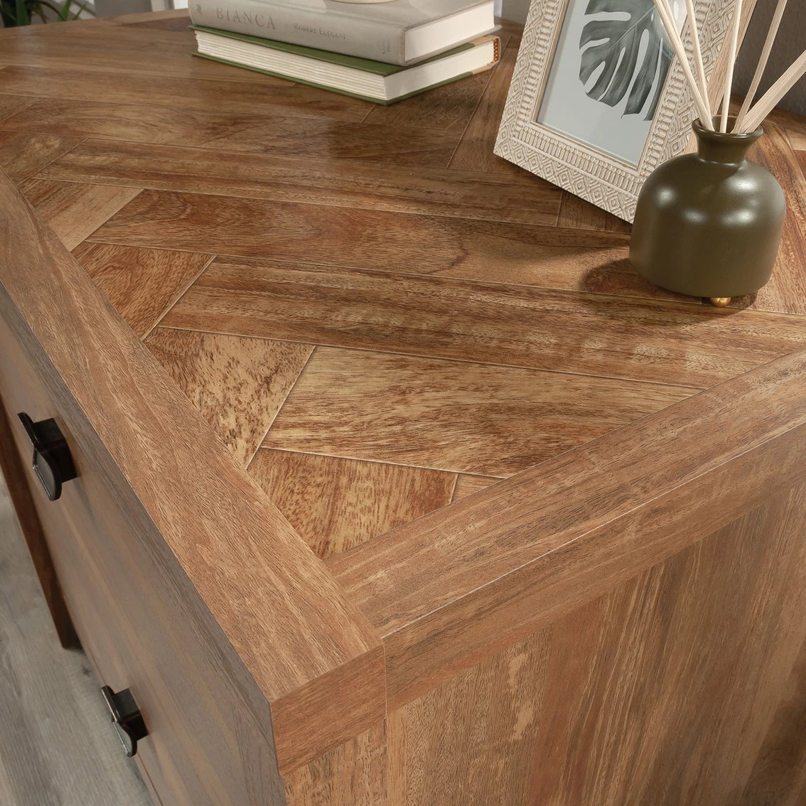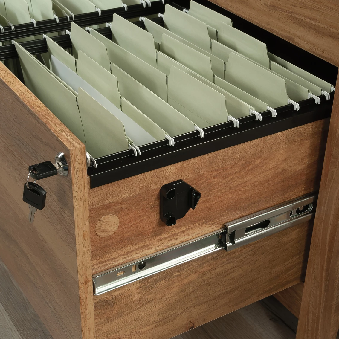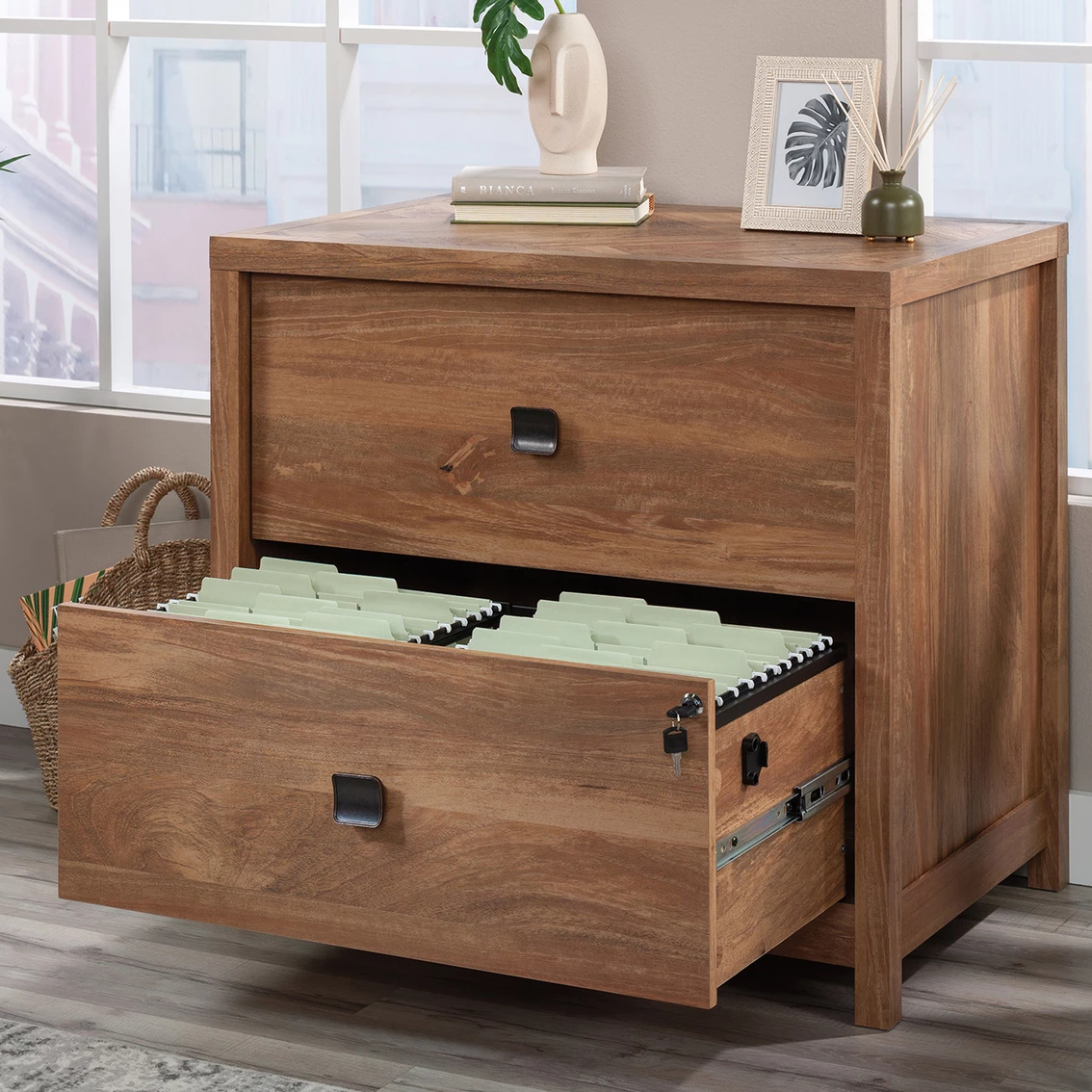 A lovely addition to your home office is just a click away with this lateral file from the Cannery Bridge collection. This 2-drawer lateral file cabinet features large drawers with full extension slides that hold letter or legal-size hanging files. Both drawers of this lateral filing cabinet lock for secure storage of your important documents. The interlocking safety mechanism allows only one drawer to open at a time for extra safety measures. The spacious top surface of this wood lateral file cabinet provides space to store and display items like a wireless speaker, stacks of magazines, decorative plants, and photos of your family and friends. A herringbone pattern detail on the top surface creates a visually stunning centerpiece to any room. This legal-size filing cabinet is finished on all sides, so it will look polished from every angle. Finished in Sindoori Mango and detailed with attractive hardware, this 2-drawer file cabinet is the storage solution your home needs. Model: 429514.