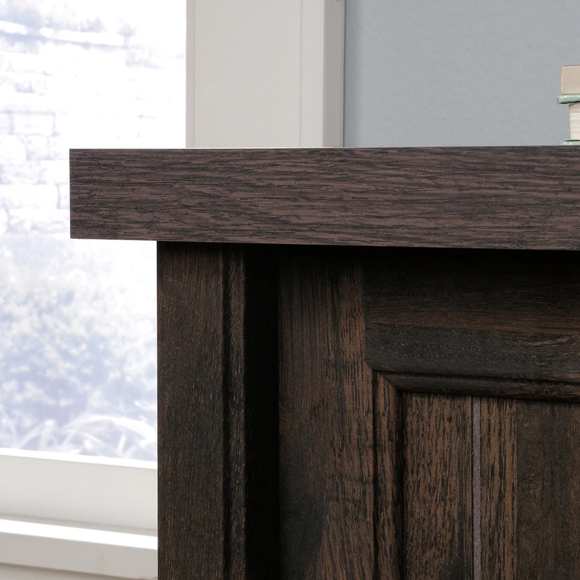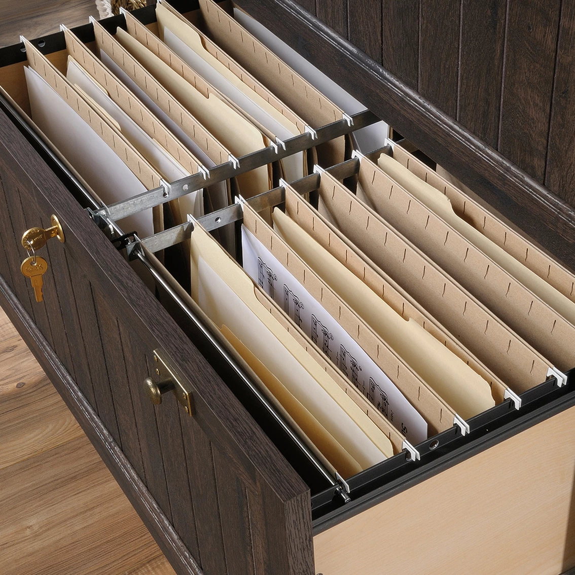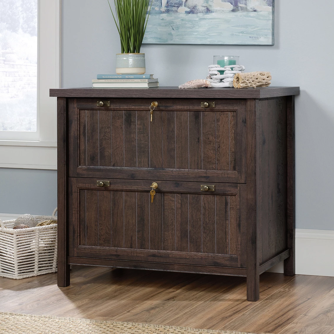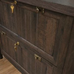Add convenient storage to your home without sacrificing the style you want with this lateral file from the Sauder Costa collection. It features a durable 1 in. thick top surface that provides you with room to display all your favorite home decor items — an accent lamp, decorative plants, knick-knacks and photos of the family. It features two large drawers with full extension slides that accommodate letter or legal size hanging files so you can keep all your documents and files organized! It also includes a patented, interlocking safety mechanism that allows only one drawer to open at a time. Each drawer features a locking mechanism for secure storage of valuables and important files. Its cottage-inspired charm make this file cabinet a great addition to any room in your home — living room, office, entryway or even in your bedroom. It looks good no matter where it stands! Finished in Coffee Oak and detailed with framed, slat-front doors, this beautiful lateral file gives your home the style and functionality its needs.