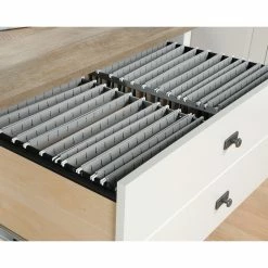 With a universal flare, this wooden lateral file cabinet from the Sauder Cottage Road collection would make the perfect addition to your home office, living room or any other place you need more storage space. The drawer features full extension slides and holds letter, legal or European size hanging files. An open shelf offers additional storage that is perfect for additional binders or folders, books or home dรฉcor. A spacious top surface can hold an accent lamp, thrift store paper weights or home office organizers. The top also makes an ideal place for your printer. With a patented T-lock drawer system, patented slide-on moldings and quick and easy assembly, your hanging folders will be at home in no time. Finished Soft White with Lintel Oak accent, this chic modern farmhouse home office filing cabinet is sure to blend in while standing out in your workspace. Quick and easy assembly. Model: 427307