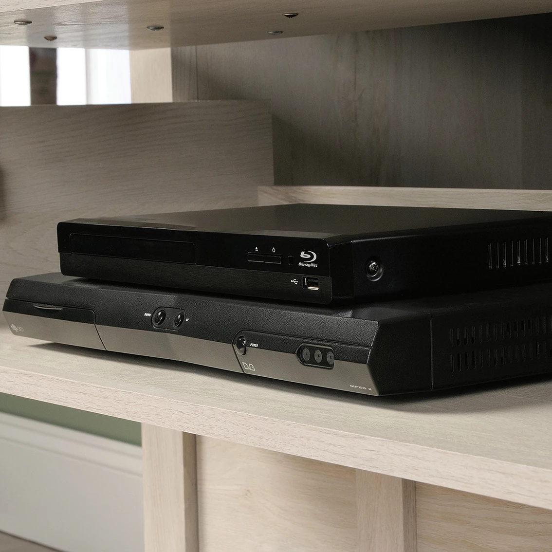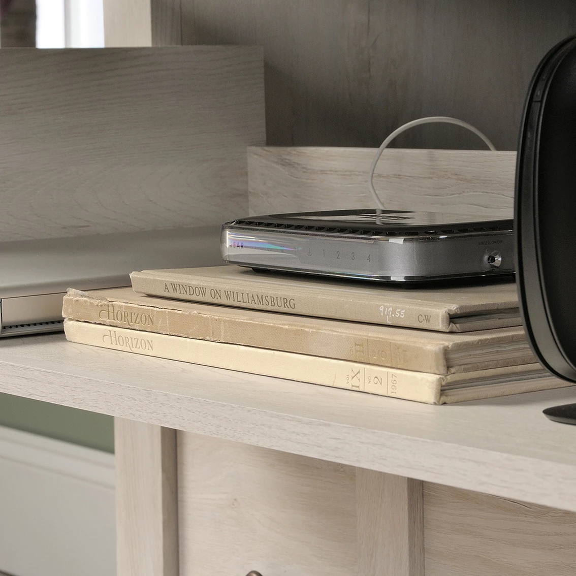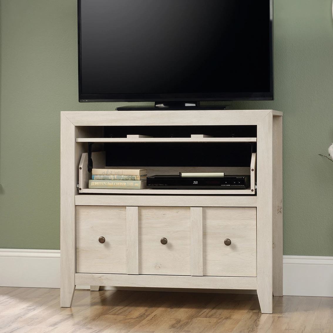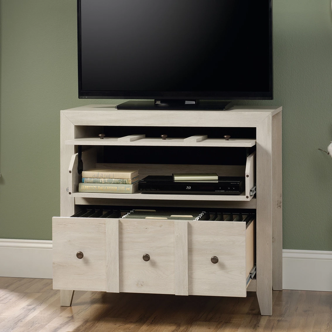 Beautiful style wherever you need it. Give your home the update it’s been longing for with the simple charm and versatile design of this console file from the Dakota Pass collection by Sauder. This handsome stand accommodates up to a 42 in. TV, making it the ideal spot to cozy up around to binge watch your favorite shows and movies or play video games with your friends. Switch it up and use its spacious top surface as a place to store and display around home items like a stereo, decorative plants, a printer and all your favorite knick-knacks. It features a uniquely designed Vanishing Drawer with full extension slides and a flip-up front for hidden storage of video and gaming components. It also features a large lower drawer with full extension slides that can hold letter and legal size hanging files so you can keep all your important documents organized. Its enclosed back panel includes cord access so you can keep all your wires neat and out of sight. Finished in Chalked Chestnut and detailed with stylish hardware, this good looking console is everything you’ve ever wanted. Assembly required. Model: 420326.