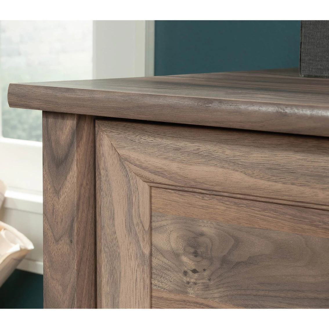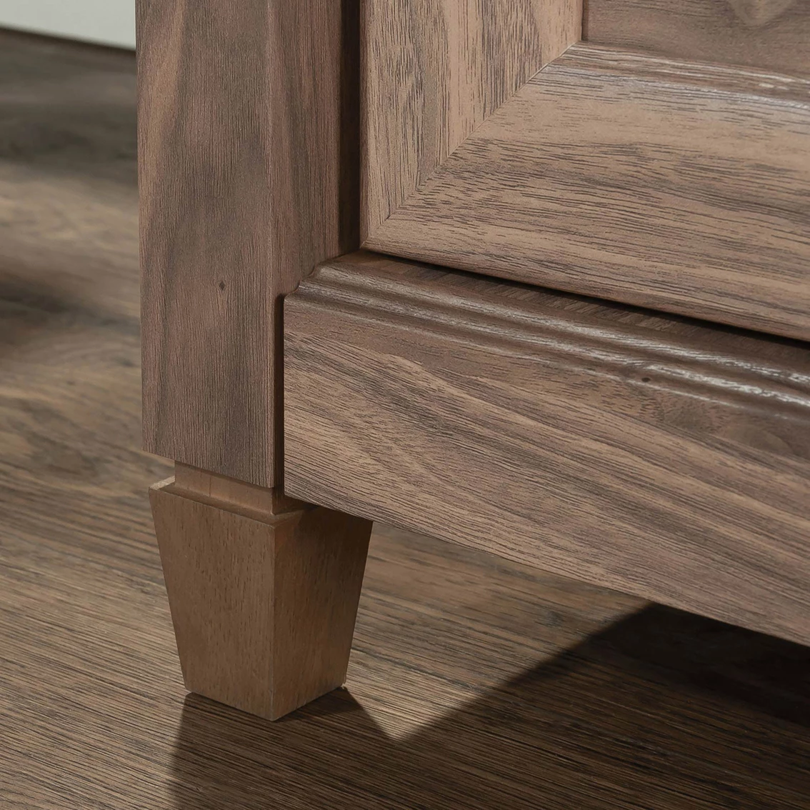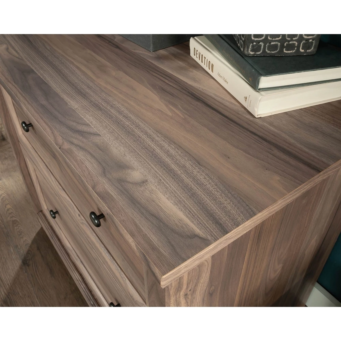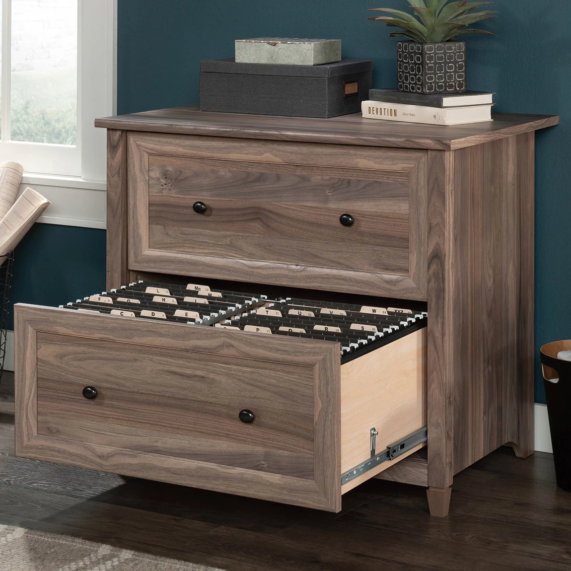 Create the storage options you need while adding the style you want with this 2-drawer lateral file cabinet from Sauder’s Edge Water collection. This file cabinet features two large storage drawers with full extension slides that can hold letter or legal-size hanging files, so you can keep all your important documents organized and easy to find. It also features an interlocking safety mechanism that allows only one drawer to open at a time for added safety. The spacious top surface also makes a great place to store and display a variety of different items like an accent lamp, your printer, decorative plants and photos of your family and friends. The elevated looks and simplistic design make this wood lateral file cabinet a perfect addition to any room in your home, whether it’s in your office or the family room. Finished in Washed Walnut, this farmhouse filing cabinet will have you feeling organized in no time. Model: 431584.
