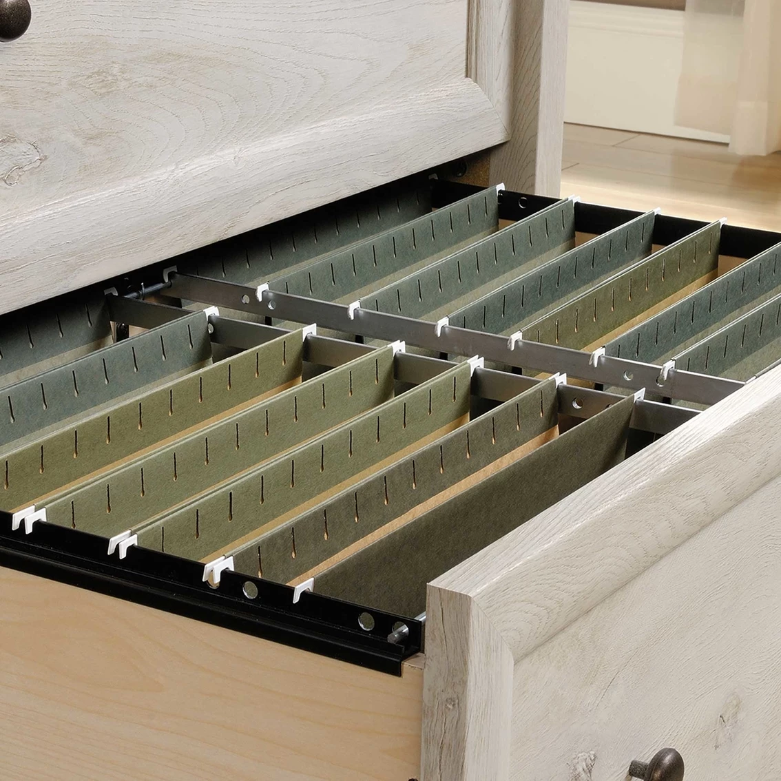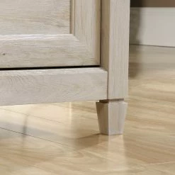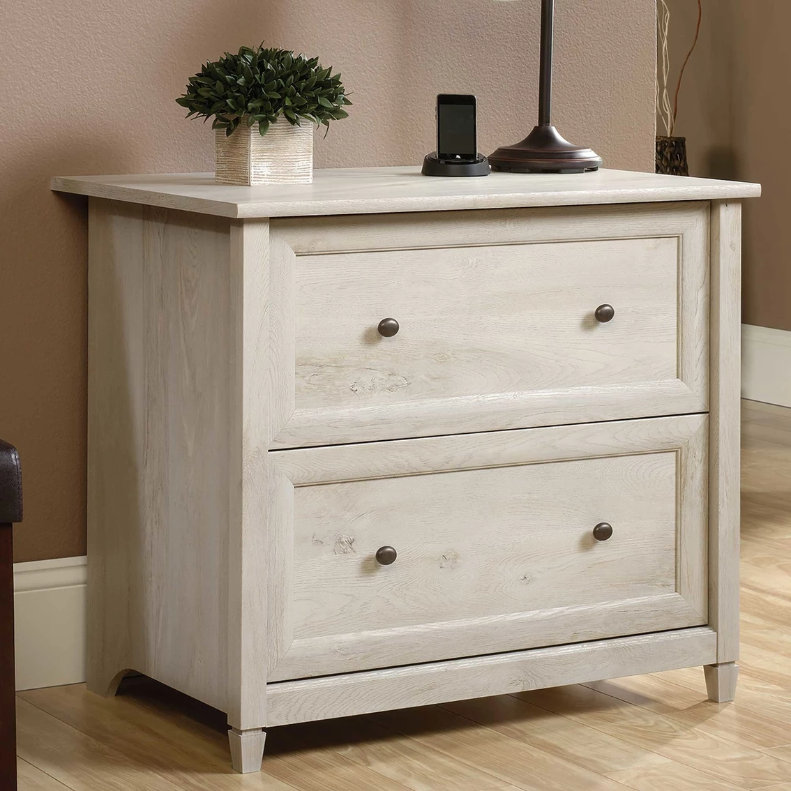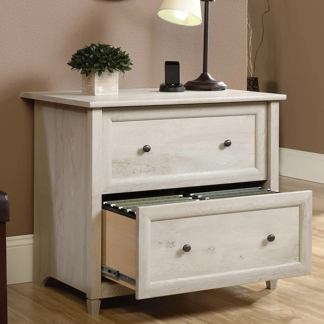 Looking to add convenient storage to your home without having to sacrifice on style? Create the storage options you need while adding the style you want with this lateral file from the Sauder Edge Water collection. It features two large storage drawers with full extension slides that can hold letter or legal size hanging files so you can keep all your important documents organized. Its patented, interlocking safety mechanism allows only one drawer to open at a time for added safety. Its spacious top surface also makes a great place to store and display a variety of different items like an accent lamp, your printer, decorative plants and photos of your family and friends. Its charming good looks and simplistic design make it a perfect addition to any room in your home, whether it’s in your office or the family room. Finished in Chalked Chestnut, this beautiful file cabinet will have you feeling organized in no time.