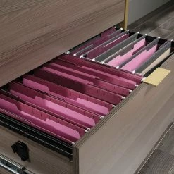 - Drawers with full extension slides hold legal or letter-size hanging files to help keep you organized