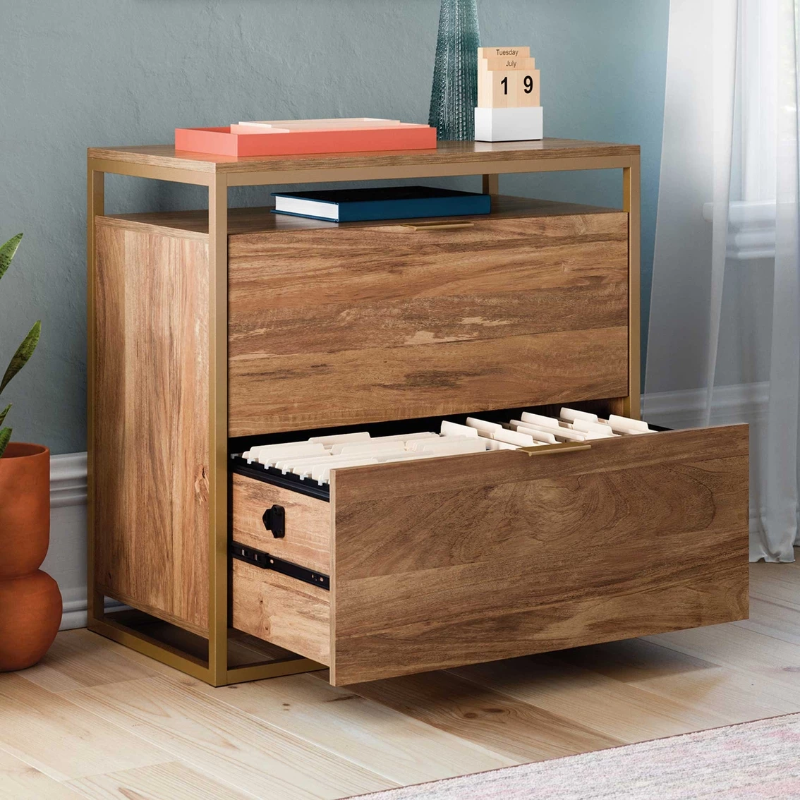File in style. Create versatile storage options in your home without having to sacrifice the beautiful design you love with this lateral file cabinet from the Sauder International Lux collection. This 2 drawer lateral file cabinet features two large drawers with full extension slides that accommodate legal or letter-size hanging files so you can keep all your important documents organized. The interlocking safety mechanism on this modern file cabinet allows only one drawer to open at a time for added safety. It also features an open storage shelf above the top drawer for easy access storage of items like folders and books. Its spacious top surface makes a great place for additional storage and display of items like an accent lamp, your printer, and photos of your family. This metal frame file cabinet is finished on all sides for versatile placement in your home office or other rooms throughout your home. Finished in Sindoori Mango and detailed with a metal frame in Satin Gold finish and stylish hardware, this charming contemporary 2 drawer file cabinet turns something boring into something tasteful. Assembly required. Model: 428211.