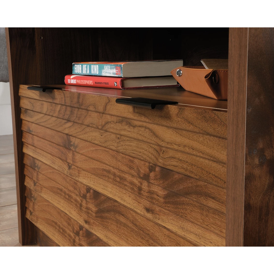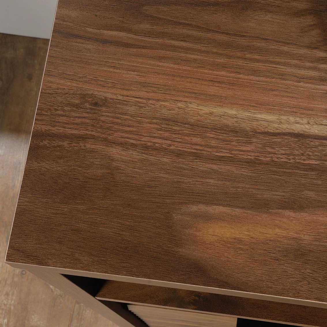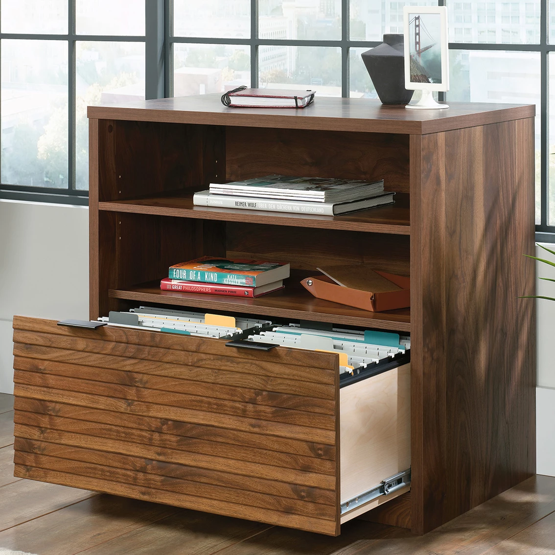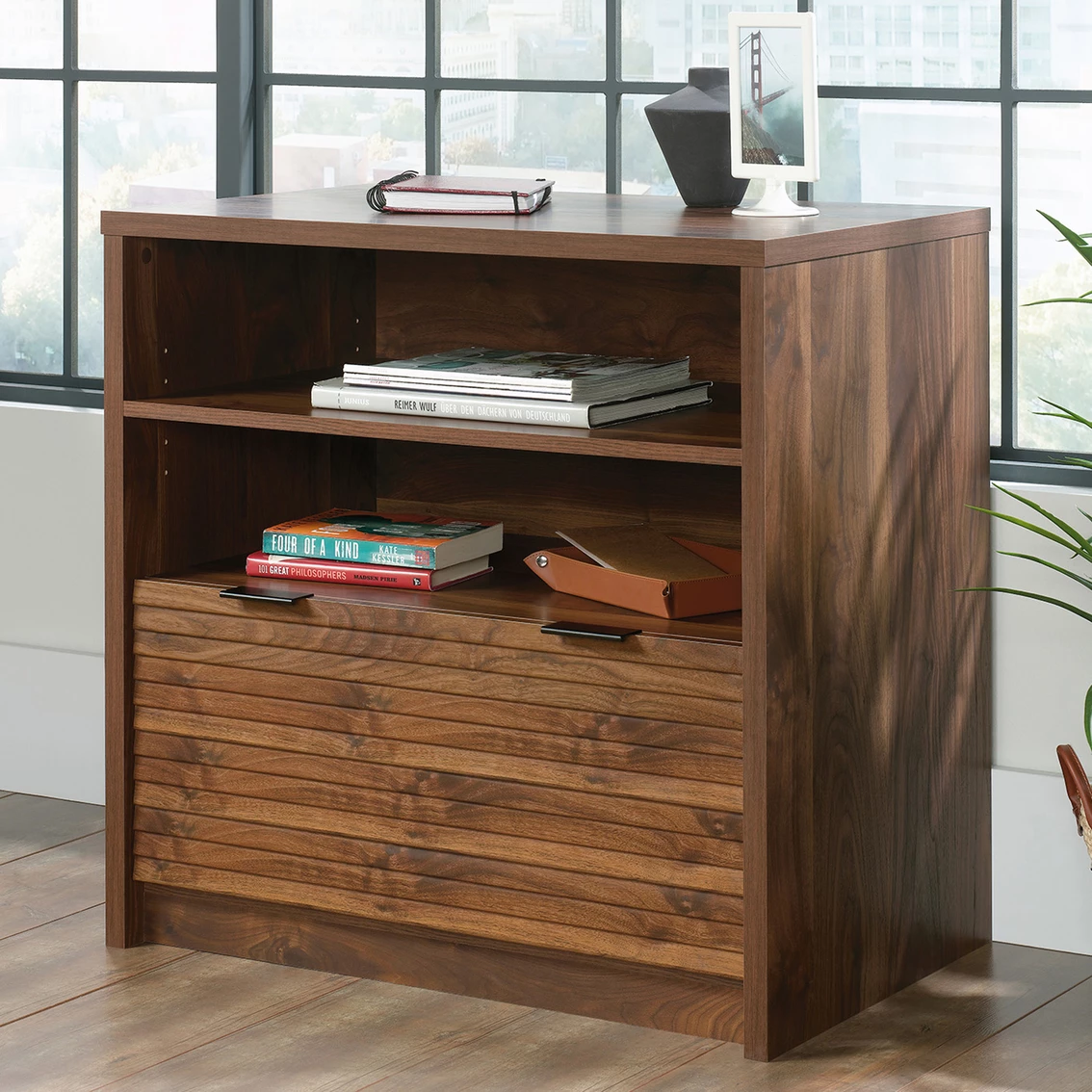 Are the stacks of paper and folders on your desk becoming unbearable? Free up your workspace and get organized with this Sauder Lateral Filing Cabinet with Open Shelf from the Harvey Park collection. This lateral file cabinet features a large drawer with full extension slides that can hold letter or European size hanging files to keep important documents safe. The open area includes an adjustable shelf that creates flexible storage for items of all shapes and sizes. Plus, these shelves provide easy-access storage for office items like binders and folders. The home filing cabinet’s spacious top surface provides additional storage and a place to display home décor items like decorative plants and framed photos. Its strong and lightweight 1-in. panel construction makes this single-drawer file cabinet easy to move. Finished on all sides in Grand Walnut, this wood lateral file cabinet will have your office space feeling organized in no time. Model: 426510.