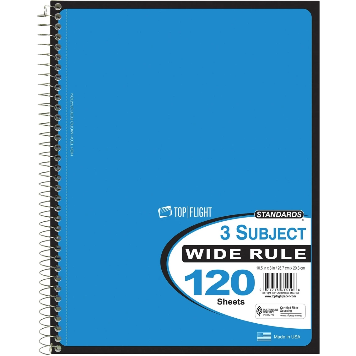 This 10.5 x 8 in. notebook from Top Flight has perforated pages, 120 sheets per pack and no-snag Coillock spiral binding. The paper is 3-hole punched so you can put it in a binder.