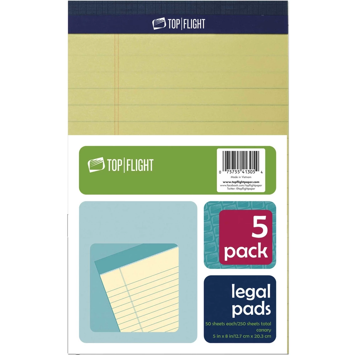 Top Flight 5 x 8 in. Canary Legal Pads are perfect for home and office use. Canary yellow sheets help avoid eyestrain. Includes five 5 x 8 in. pads, 0.375 in. rule, 50 sheets each (250 sheets total). Model: 41305.